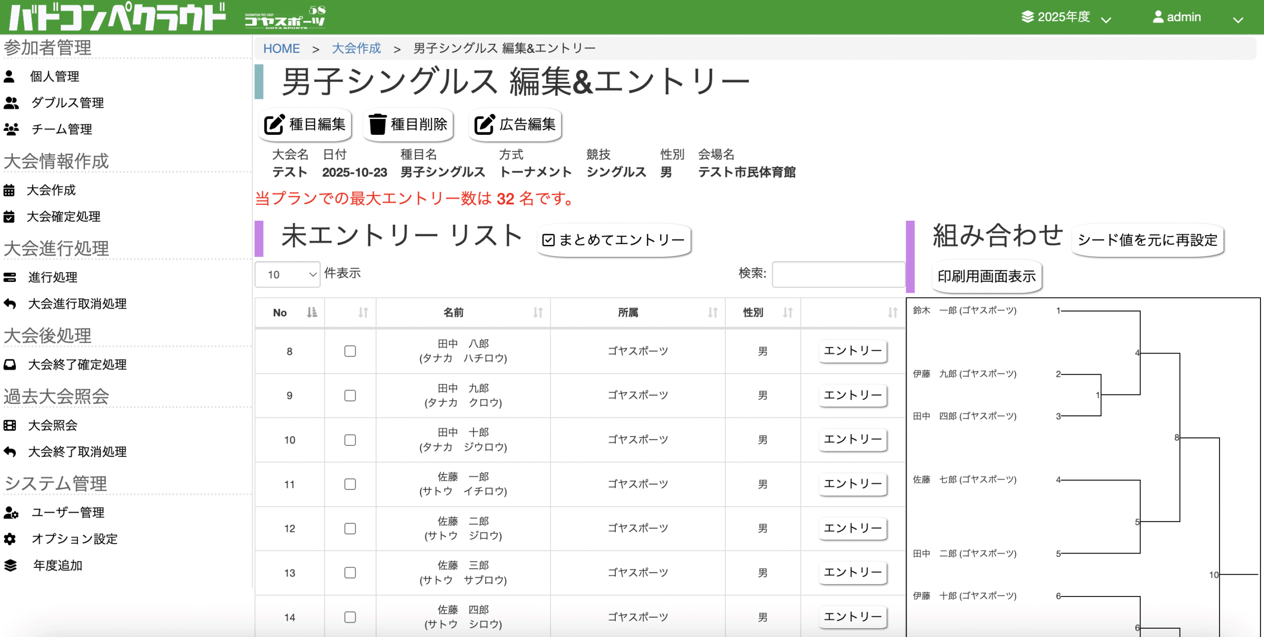 参加者管理(個人、ダブルス、チーム)、大会作成(組み合わせ作成...)、大会進行処理(スコア表発行、結果入力、オーダー受付など...)などの基本的な機能は搭載。