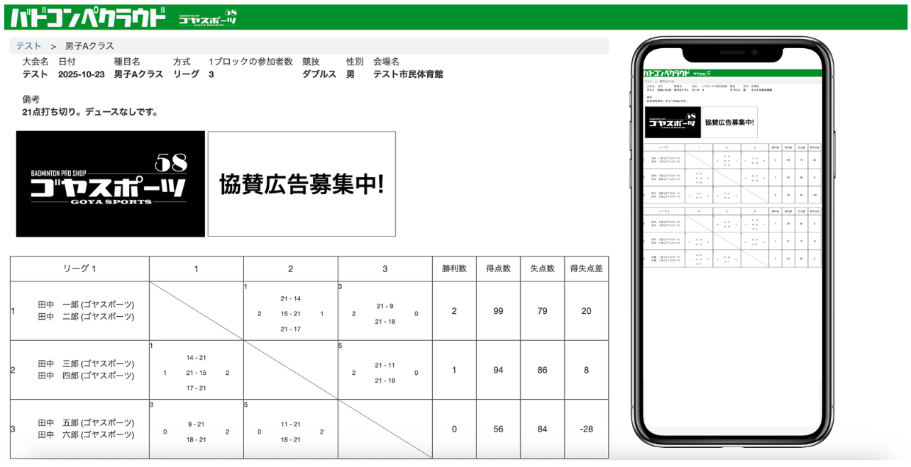 大会の進捗状況及びアナウンスは速報ページで共有。団体戦のオーダーはスマートフォンで提出。協賛広告は速報ページに掲載で広告効果アップ&パンフレット廃止で経費削減。
