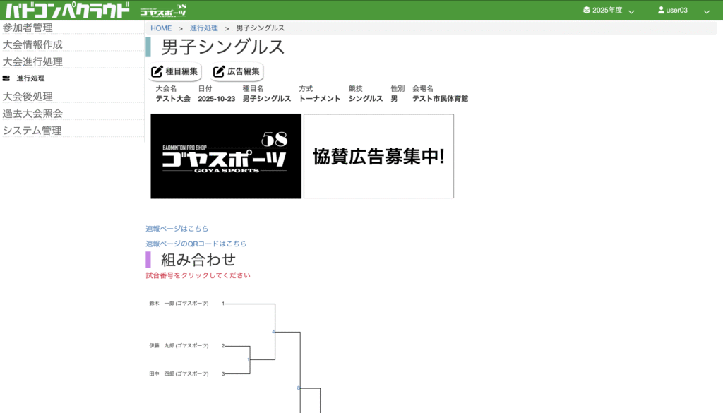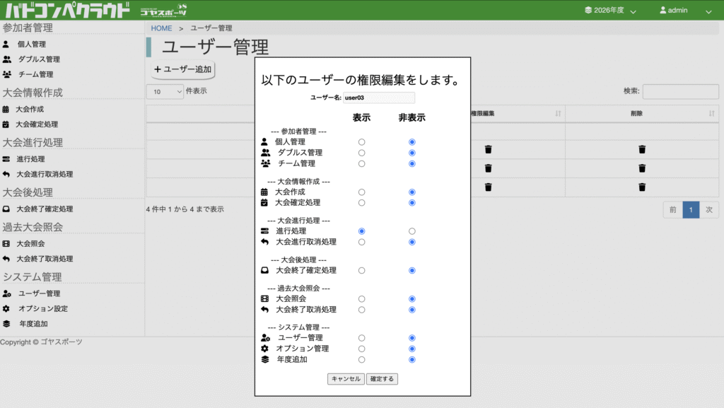 結果入力やスコア表出力などの"進行処理"のみ操作させたい場合、当人のユーザーの権限を"進行処理"のみ許可することで、誤操作を防ぐことができます。