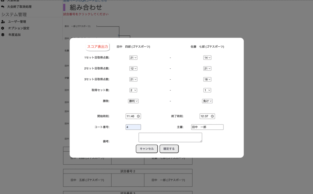 開始時刻、終了時刻、コート番号、主審を入力可能に 2025-12-18 最終更新日時 : 2025-12-18 goya-sports 試合結果の入力項目に開始時刻、終了時刻、コート番号、主審を追加しました。 シングルス入力画面 無料体験お申し込みはこちら!