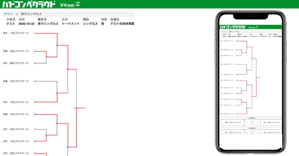 リーグでは得失点差も自動計算で表示。トーナメントも対応。