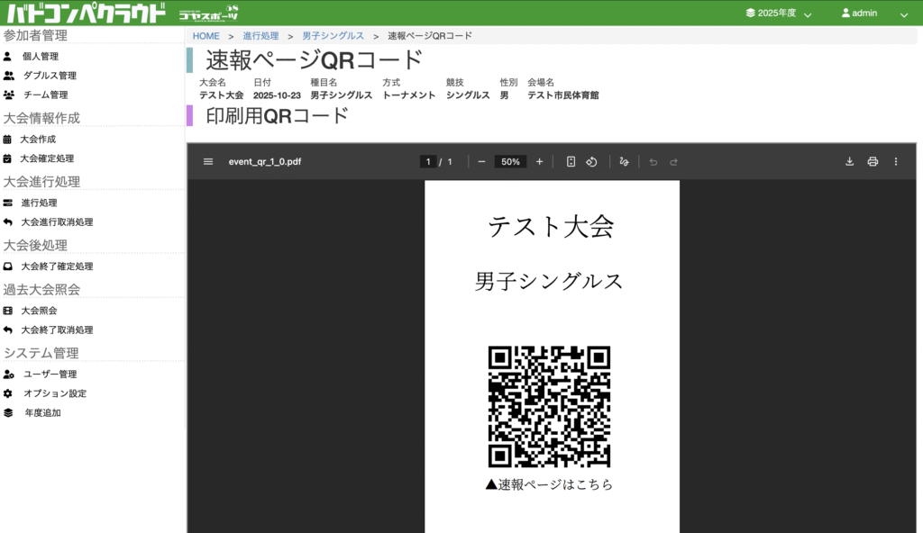 参加者が速報ページへのアクセスする手段として、大会会場にQRコードの掲示が効果的。そのQRコードを発行する機能を提供。